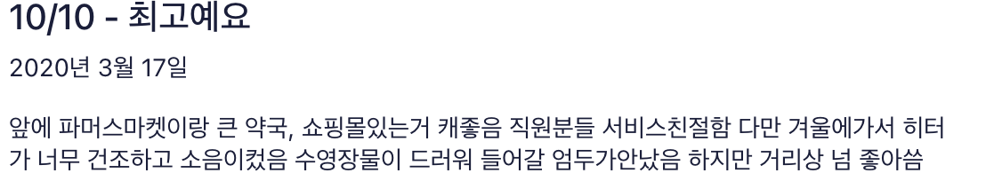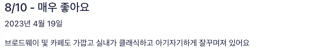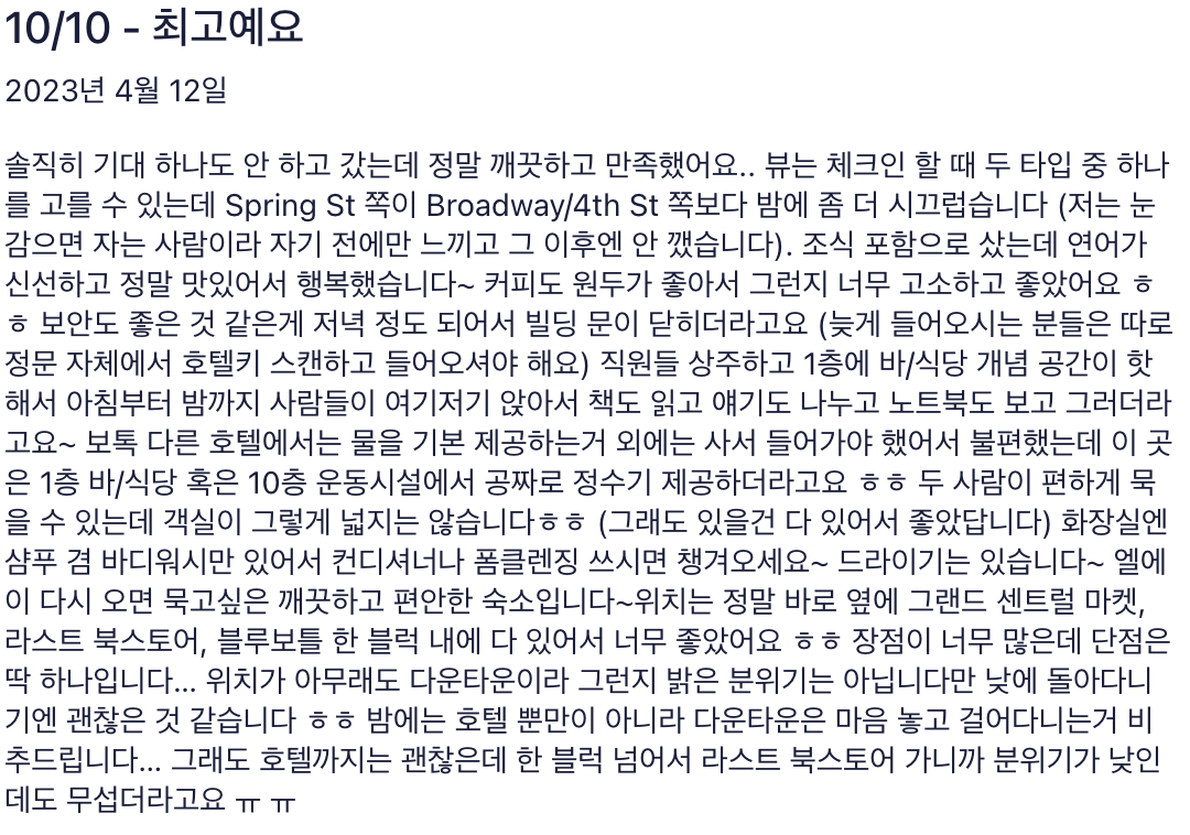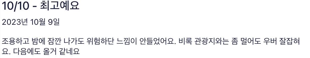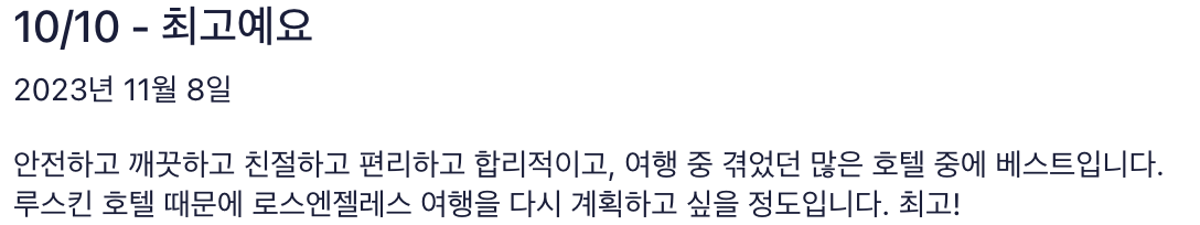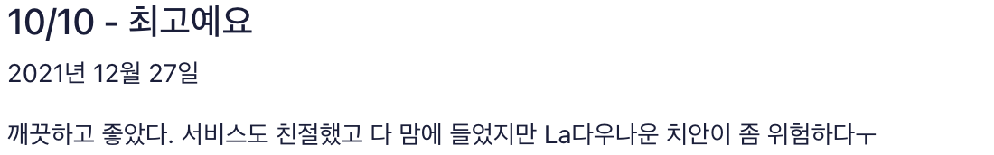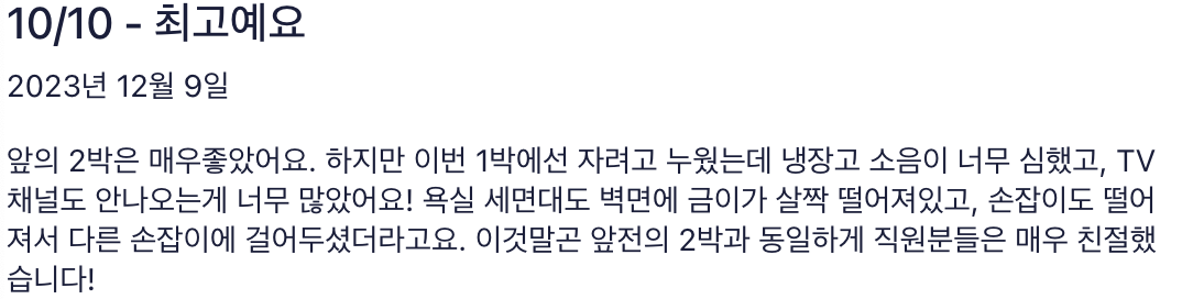- 만족도: 편안한 침대 및 전반적인 숙박 시설 상태에 대한 굉장히 높은 만족도