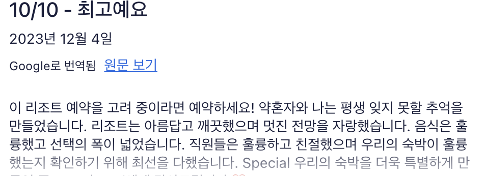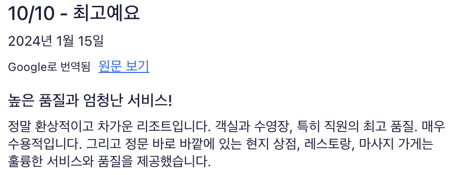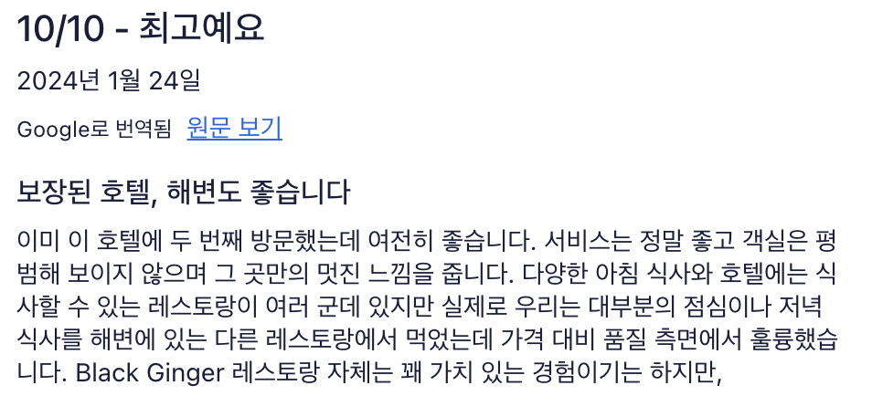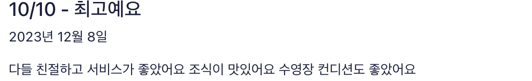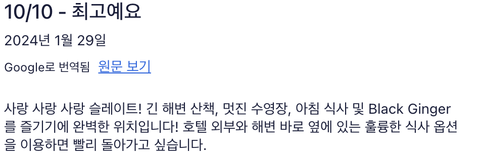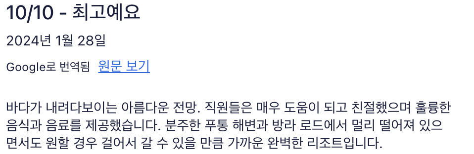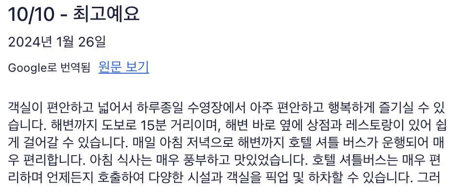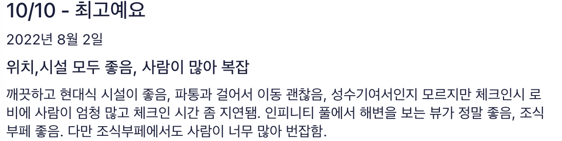 - 고객 서비스의 친절함과 해변과의 가까운 위치에 대한 높은 만족도.