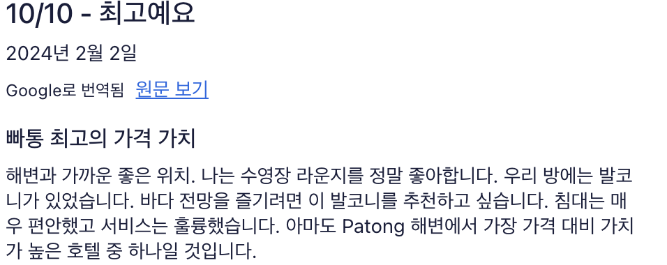이렇게 여행 스타일은 사람마다 다른데, 푸켓은 웬만하면 방문하는 모두를 만족시키는 여행지입니다. 푸켓의 바다는 보기만 해도 이쁘지만, 배를 타고 스노클링 투어나 다이빙 투어를 할만큼 수중환경도 좋습니다. 고급 리조트가 즐비해서 호캉스를 즐길 수도 있으며, 가성비가 넘치는 숙소들도 많죠. 또한, 핫한 밤을 즐길 수 있는 클럽이 있으며, 조용한 카페나 맥주 한 잔 마시기 좋은 펍들도 많아요. 마지막으로 태국 음식은 세계적으로 맛있기로 유명하죠. 그렇기 때문에 푸켓은 아시아 휴양지 중 항상 1위 자리를 차지한다고 생각합니다.